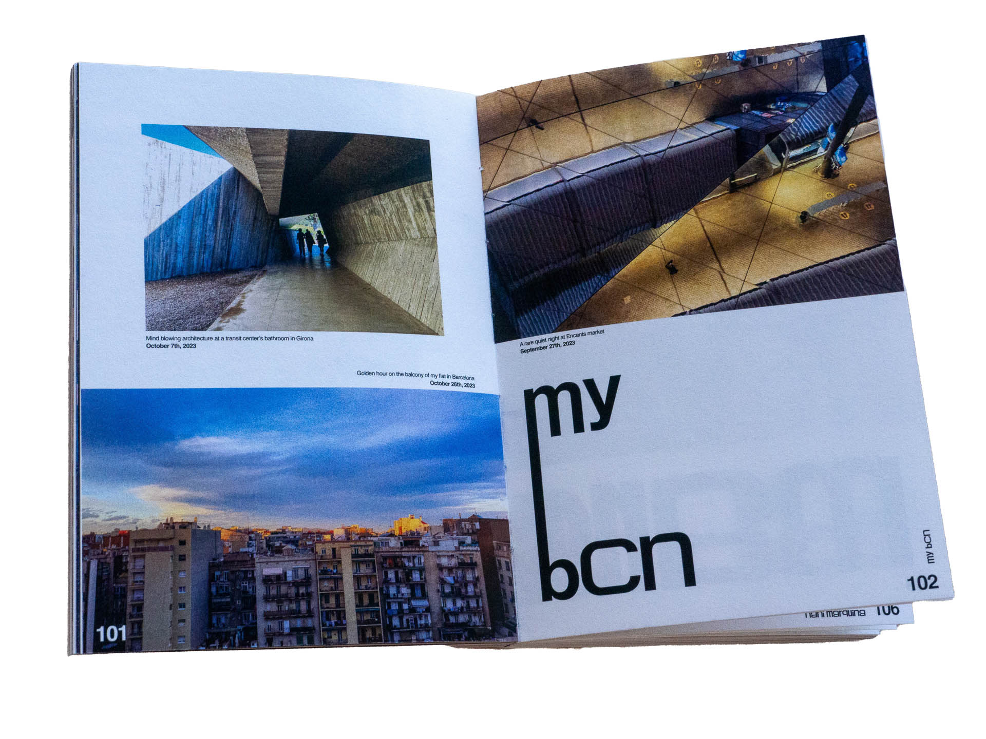 Design is everywhere in Barcelona. Buildings, benches, and even side walk tiles have ties to renowned designers that helped shape the city. I was surrounded by inspiration at every corner. This book is the culmination of that experience. It prioritizes systems and grids, strategically breaking the rules to create a visceral feeling for the reader.